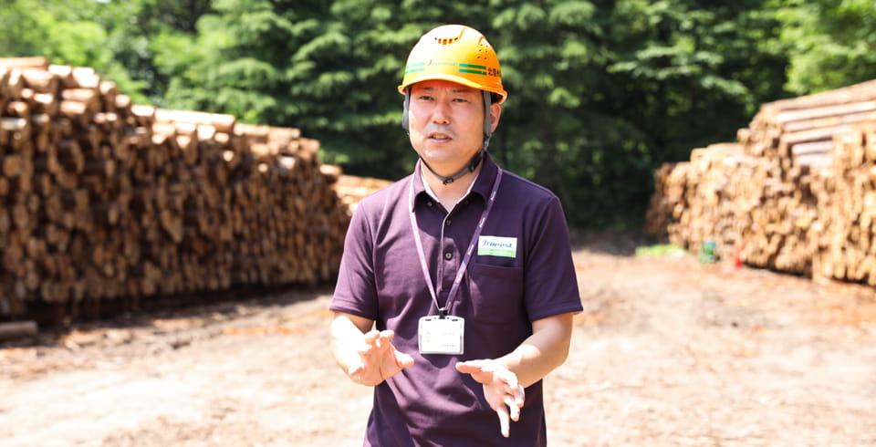 切り出した木材は、その場でスマートフォンに口径・本数等のデータを入力し、インターネットで伝送したうえで、中間土場(ストックヤード)に運ばれる。ここでも情報とモノの動きの合理化・効率化が行われている。同組合の業務主任の尾淵さんは、「軟弱な路網や細い農道は大型トラックやトレーラーで入ることができません。そのため大型車でもアクセスしやすい場所に中間土場を設けています。ここに中国向けの輸出用木材、建築用木材、バイオマス用木材など規格ごとに大量に木材をストックすることで、木材流通を効率化しています。一度にたくさんの物量を動かせるので、取引の面でも有利です」と中間土場の役割を解説する。