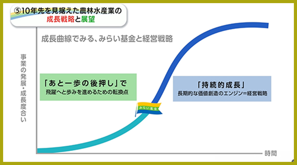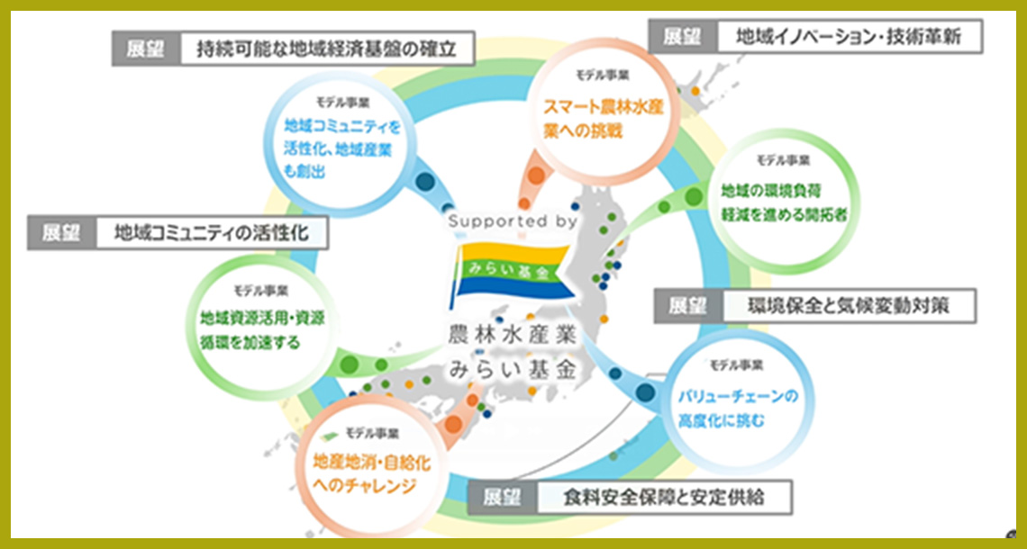 また、様々な農林水産業者の取組みの参考となるよう、モデルとなり得る事業を継続的に情報発信していきます。これにより、発展的効果が全国に波及していくことで、“農林水産業のみらいに貢献”することを目指しています。